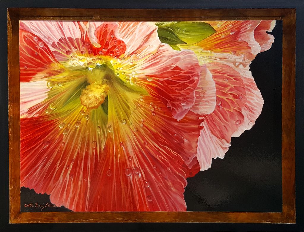 The interior of this Hollyhock captured some summer rain drops, and became a prism for the bright sun to shine through the droplets, sparkling like diamonds.