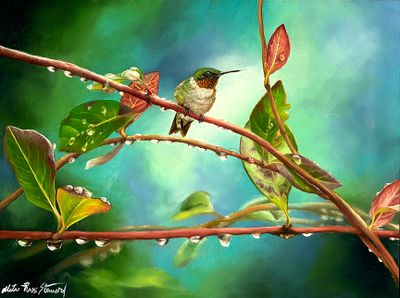 In "Honeysuckle Rain," a vibrant Ruby Throat hummingbird is captured in a moment of delicate repose, perched gracefully on a vine adorned with glistening raindrops, sparkling like tiny gems. The hummingbird's colors are carried through the rest of the piece in a harmonious palette. The tranquil scene evokes a welcome bit of serenity in an often hectic world.
