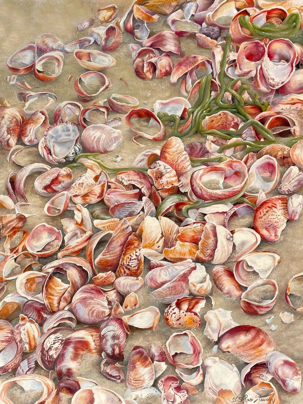 painted in a photographic realistic style, these slipper shells were piled up on Red River Beach on the south side of Cape Cod. Their lovely pink and russet coloring adds a light touch to any decor.