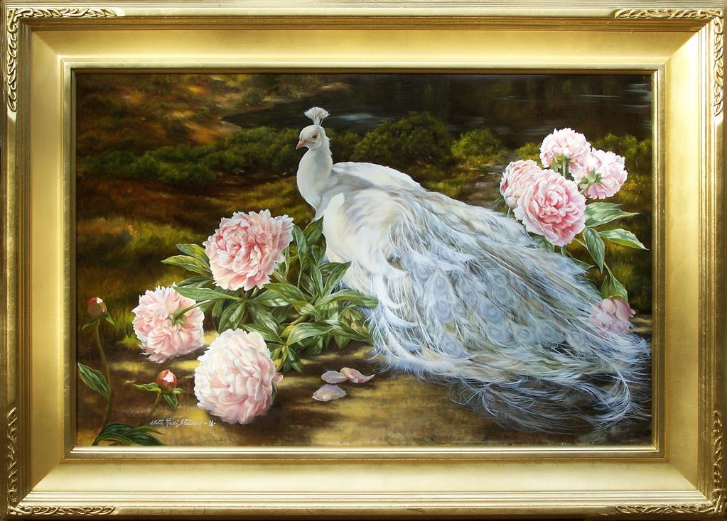 $6500.00 24" x 36" oil/linen A stately white Peacock walking through the darkening landscape seems almost glowing, along with the pink peonies on either side. Colors throughout his feathers include shades of blue, gold and rose. This piece was accepted into the Audubon Artists of America 75th Annual juried show in NYC. Hand carved & gilded frame included .
